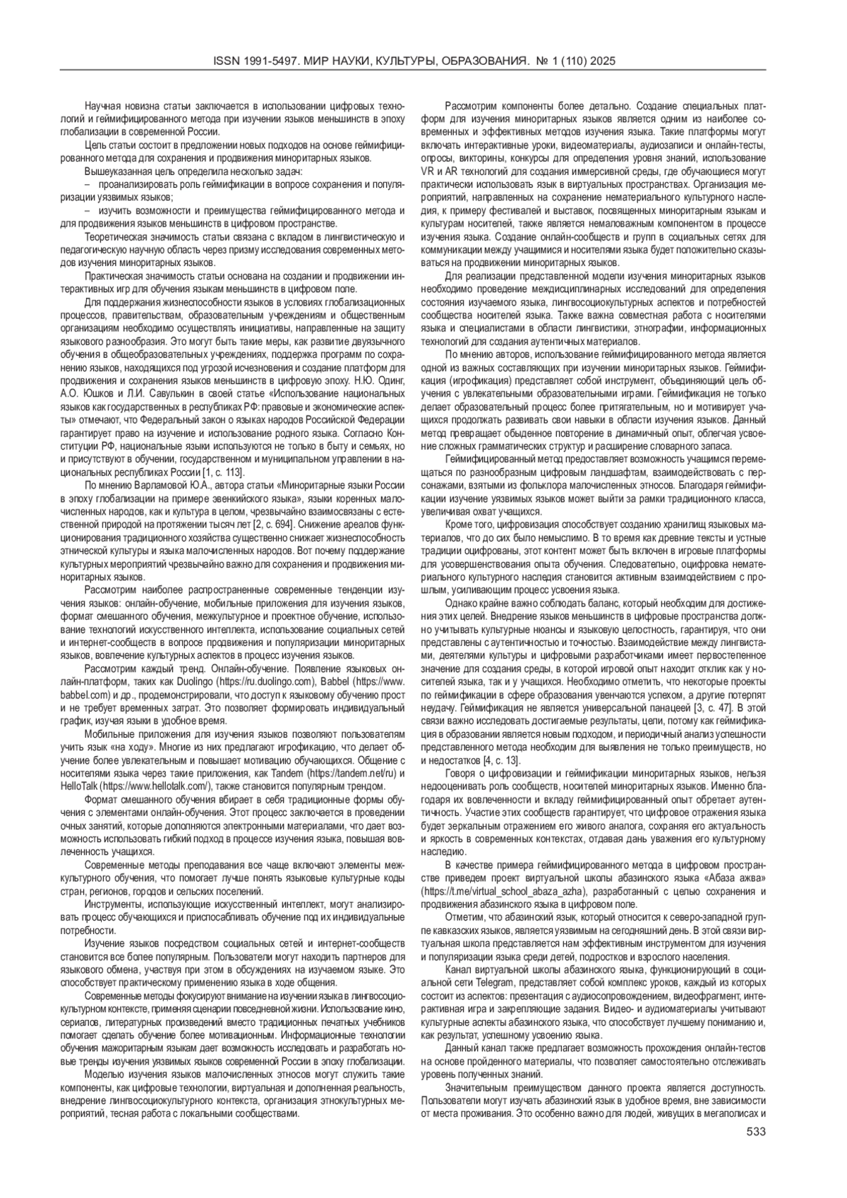 Данная статья посвящена анализу новых тенденций изучений миноритарных языков. Рассмотрены новые тренды при изучении уязвимых языков (онлайн-обучение, мобильные приложения для изучения языков, формат смешанного обучения, межкультурное обучение, использование технологий искусственного интеллекта, использование социальных сетей и интернет-сообществ в вопросе продвижения и популяризации миноритарных языков, вовлечение культурных аспектов в процесс изучения языков). Также в представленном научном труде сообщается о роли цифровизации, которая способствует созданию хранилищ языковых материалов, что положительно сказывается на сохранении и продвижении миноритарных языков. Проанализирован геймифицированный метод изучения языков меньшинств в качестве передовой технологии в вопросе языкового освоения. Представлен проект виртуальной школы абазинского языка «Абаза ажва» в качестве примера геймифицированного метода в цифровом пространстве. Сделаны выводы, что использование новых трендов при изучении языков малочисленных этносов может положительно сказаться на сохранении языкового разнообразия как части нематериального культурного наследия России.
