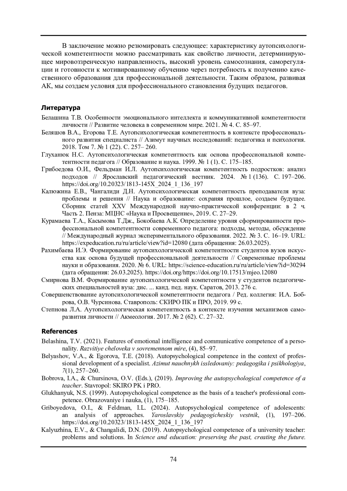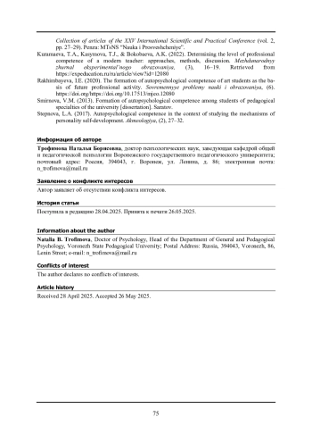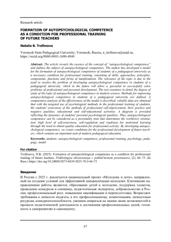 ТРОФИМОВА Н. Б. ФОРМИРОВАНИЕ АУТОПСИХОЛОГИЧЕСКОЙ КОМПЕТЕНТНОСТИ КАК УСЛОВИЕ ПРОФЕССИОНАЛЬНОЙ ПОДГОТОВКИ БУДУЩИХ ПЕДАГОГОВ // ПСИХОЛОГИЯ ОБРАЗОВАНИЯ В ПОЛИКУЛЬТУРНОМ ПРОСТРАНСТВЕ. 2025. № 2 (70)