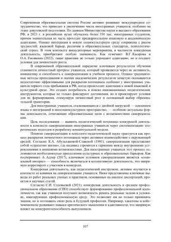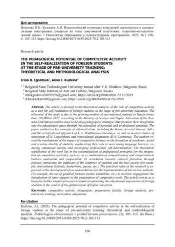Статья посвящена теоретическому анализу роли конкурсной деятельности как инструмента самореализации иностранных учащихся на этапе довузовской подготовки. Актуальность исследования обусловлена ростом числа иностранных студентов в России (более 350 тыс. человек в 2023 г. по данным Министерства науки и высшего образования РФ) и необходимостью разработки педагогических стратегий, способствующих их интеграции в образовательное пространство через активизацию личностного и профессионального потенциала. В работе синтезируются ключевые концепции самореализации, включая теорию социального интереса А. Адлера и деятельностный подход К. А. Абульхановой-Славской, а также современные исследования мотивации (Е. Н. Легочкина) и межкультурной адаптации (Д. Н. Литвинова). Авторы раскрывают механизмы влияния конкурсных форматов на формирование академической, социальной и творческой идентичности учащихся, подчеркивая их роль в преодолении языковых барьеров, снижении ситуативной тревожности и развитии профессионального самоопределения. Теоретическая значимость работы заключается в систематизации педагогических принципов интеграции конкурсной деятельности, таких как: а) сочетание соревновательности и кооперации для баланса между мотивацией и сотрудничеством; б) ориентация на культурный плюрализм через проекты, соединяющие традиции стран учащихся и принимающего общества (например, межкультурные фестивали, хакатоны, квесты и др.). Практическая ценность исследования выражена в разработке рекомендаций по внедрению интерактивных методов. Например, использование геймифицированных форматов (онлайн-марафоны и др.) для повышения вовлеченности, внедрение тьюторской поддержки при подготовке конкурсных работ. Статья служит основой для дальнейших эмпирических исследований, направленных на оптимизацию образовательных траекторий иностранных учащихся в условиях глобализации высшей школы.