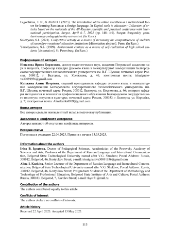 3. Акифи О.И., Легочкина Е.Н., Гончарова А.В. Хакатон по русскому языку как иностранному: содержание, опыт проведения и перспективы // Казанская наука. 2024. № 4. С. 18-21.