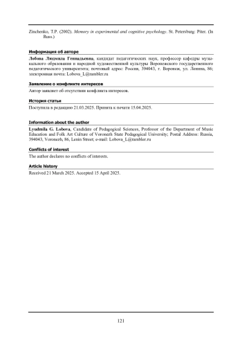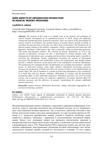 ЛОБОВА Л. Г. НЕКОТОРЫЕ АСПЕКТЫ ИНФОРМАЦИОННОГО ВЗАИМОДЕЙСТВИЯ В ПРОЦЕССАХ МУЗЫКАЛЬНОЙ ПАМЯТИ // ПСИХОЛОГИЯ ОБРАЗОВАНИЯ В ПОЛИКУЛЬТУРНОМ ПРОСТРАНСТВЕ. 2025. № 2 (70)