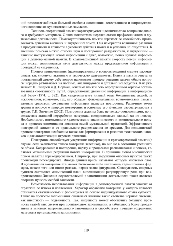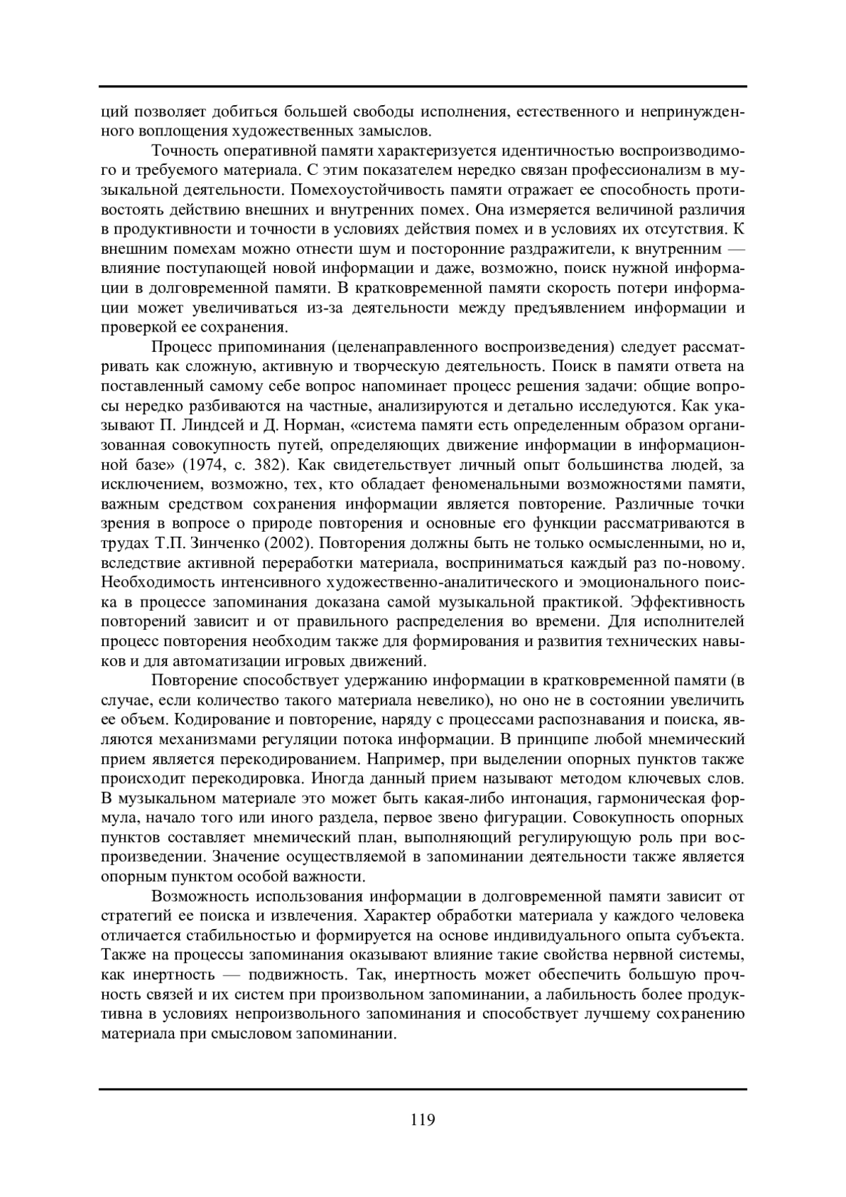Целью данного исследования является определение некоторых особенностей и приемов развития музыкальной памяти как информационного процесса, в котором наряду с запечатлением, хранением и воспроизведением форм музыкального опыта присутствуют и аспекты участия самой памяти в его формировании. К специфическим особенностям психической памяти можно отнести ее способность воспроизводить прошлое именно в качестве прошлого, но с ориентацией на будущее. Доминирующая роль в музыкальной памяти принадлежит слуховому компоненту, который находится в органической взаимосвязи с образной, эмоциональной, словесно-логической, и, что особенно ярко проявляется у музыкантов-исполнителей, с двигательной (психомоторной) памятью. Селекция сенсорной информации, а также отбор необходимых для этого операций обусловливается решением стратегических задач. Укрупнение информационных единиц, группировка и иерархическое структурирование дают возможность преодолевать информационную нагрузку, значительно увеличивая количество перерабатываемой информации. Многоплановость и многоуровневость формы, ладовой организации, мелодического рисунка за счет укрупнения музыкальной информации обеспечивают смысловую иерархию ее восприятия. Механизмами регуляции потока информации являются кодирование и повторение. Гибкая система кодов кратковременной памяти способствует оптимизации процессов переработки информации, повышает продуктивность оперативной памяти, позволяет добиться большей свободы воплощения художественных замыслов. Также рассматривается роль повторения как средства сохранения информации. Отмечается, что при любом мнемическом приеме происходит перекодировка информации, а операционные механизмы отличаются индивидуальным своеобразием. Индивидуальный опыт, уровень психической активности, а в музыкальной деятельности и субъективная значимость музыкального материала влияют на процессы отбора и оперативность памяти, преобразуя уже сложившийся музыкальный опыт.