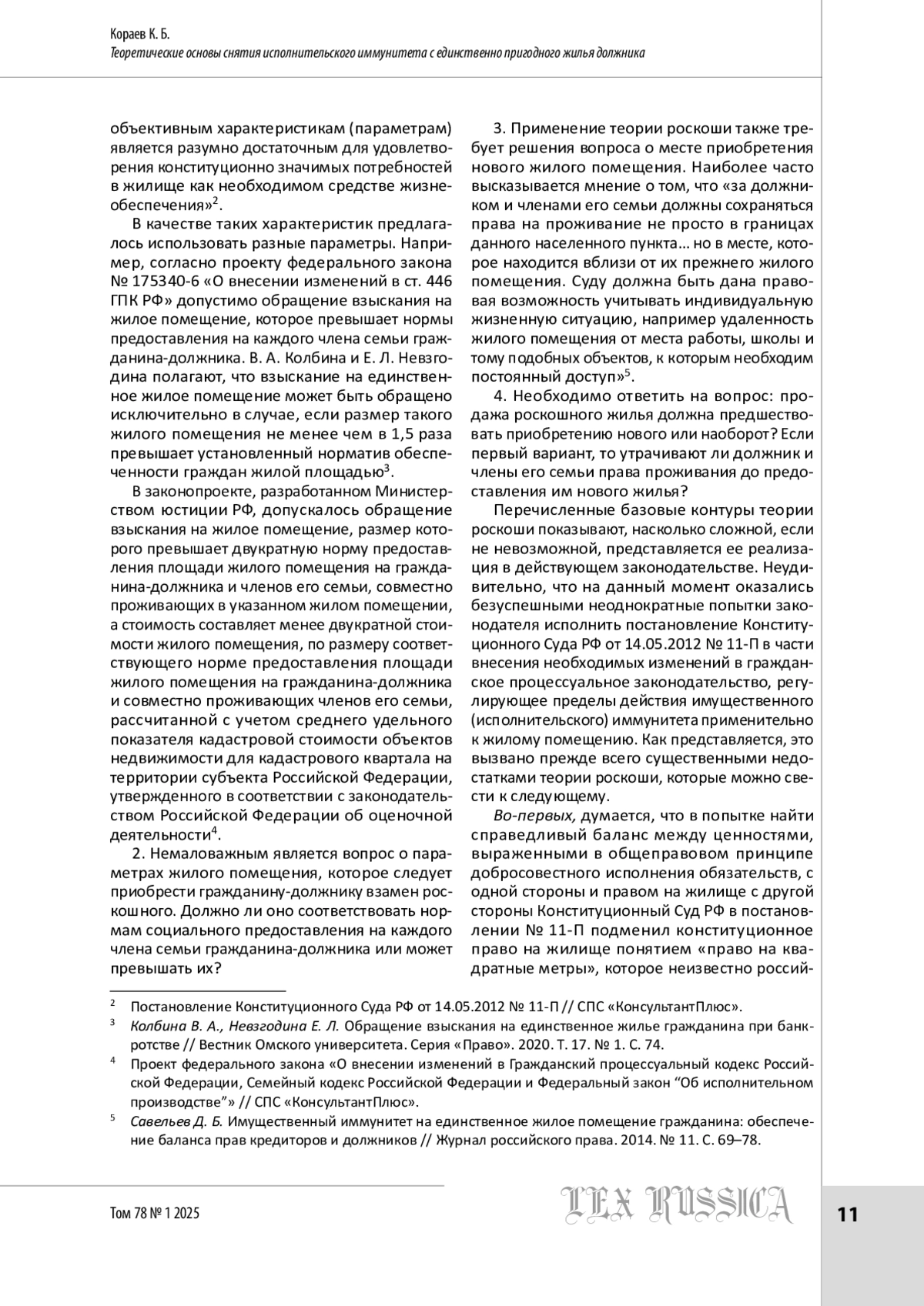 4. Савельев Д. Б. Имущественный иммунитет на единственное жилое помещение гражданина: обеспечение баланса прав кредиторов и должников // Журнал российского права. 2014. № 11. С. 69-78.