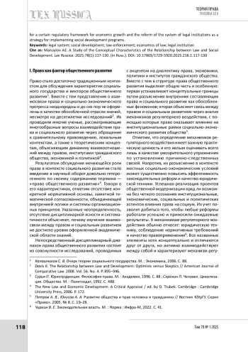 МАНУЙЛОВ А. Е. ИССЛЕДОВАНИЕ КОНЦЕПТУАЛЬНЫХ ХАРАКТЕРИСТИК ВЗАИМОСВЯЗИ ПРАВА И ОБЩЕСТВЕННОГО РАЗВИТИЯ // LEX RUSSICA (РУССКИЙ ЗАКОН). 2025. ТОМ 78, № 1