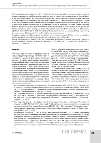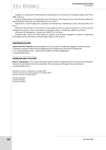 6. Жадяева М. А., Янина И. Ю. Общественная опасность «насильственного» и «вооруженного» хулиганства: проблемы законодательной техники и правоприменения // Российский судья. 2022. № 2. С. 21-26.