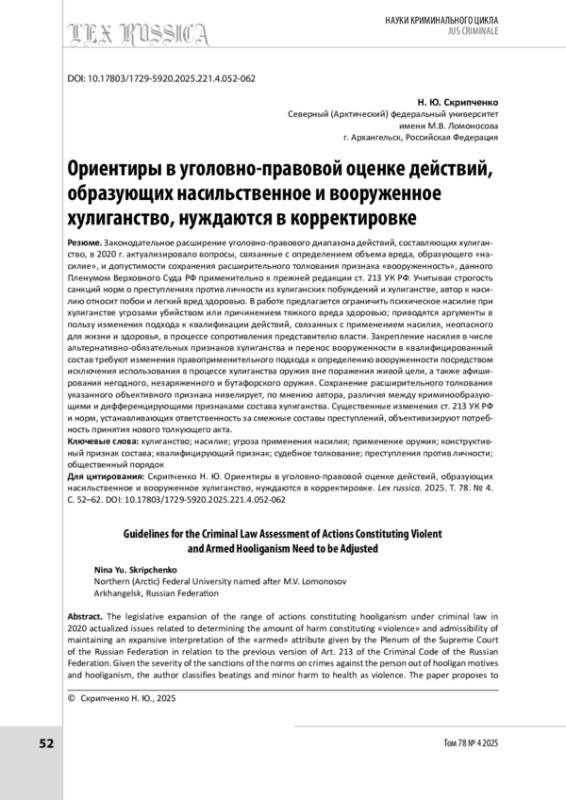 Законодательное расширение уголовно-правового диапазона действий, составляющих хулиганство, в 2020 г. актуализировало вопросы, связанные с определением объема вреда, образующего «насилие», и допустимости сохранения расширительного толкования признака «вооруженность», данного Пленумом Верховного Суда РФ применительно к прежней редакции ст. 213 УК РФ. Учитывая строгость санкций норм о преступлениях против личности из хулиганских побуждений и хулиганстве, автор к насилию относит побои и легкий вред здоровью. В работе предлагается ограничить психическое насилие при хулиганстве угрозами убийством или причинением тяжкого вреда здоровью; приводятся аргументы в пользу изменения подхода к квалификации действий, связанных с применением насилия, неопасного для жизни и здоровья, в процессе сопротивления представителю власти. Закрепление насилия в числе альтернативно-обязательных признаков хулиганства и перенос вооруженности в квалифицированный состав требуют изменения правоприменительного подхода к определению вооруженности посредством исключения использования в процессе хулиганства оружия вне поражения живой цели, а также афиширования негодного, незаряженного и бутафорского оружия. Сохранение расширительного толкования указанного объективного признака нивелирует, по мнению автора, различия между криминообразующими и дифференцирующими признаками состава хулиганства. Существенные изменения ст. 213 УК РФ и норм, устанавливающих ответственность за смежные составы преступлений, объективизируют потребность принятия нового толкующего акта.