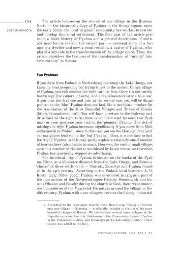 On the example of the Karelian village Pyalma, the author considers the construction of the image of the Russian traditional Northern village by former city dwellers. Based on their own ideas about the rural authenticity, they represent rural traditions to urban tourists, whose knowledge of the rural is determined by popular culture and is not supported by practical skills. By comparing the history of Pyalma with other examples of the contemporary public work with natural-cultural heritage in North-West Russia, the author shows that the typification and museumification of traditional rurality in many villages are determined by the individual desire to preserve them and ensure their development by attracting tourists and introducing activities of the ‘economy of impressions’. The author notes that for most ‘seasonal’ residents (local and urban summer residents), the historicity of the place is not as important as the natural-infrastructural features of the village location. Thus, today urban projections of rurality in historical settlements are clearly divided into general and private, commemorative-tourist and personal economic practices, which together form a post-productivist ‘new rurality’ of historical villages in the Russian North.