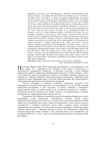 В статье рассматривается мнемоническая составляющая поэзия Вяч. Иванова. Использование мотивов и темы памяти продиктовано твердой убежденностью поэта и ученого в существование единого источника лирики, генетически связанного с прадионисийством - культовой праосновой всех видов искусств, включая поэтическое. Представление темы памяти, исходящей из данной теоретической установки, не выглядит поэтому второстепенным приемом, а, скорее, является методом духовного самопознания, проникновения в тайны мира, жанровое воплощение которых происходит слиянием лирического «я» с общей мнемонической организацией бытия. А так как память есть одновременно и неотъемлемый атрибут, и предикат мироздания, объединяющий времена, эпохи, стили, жанры, идеи, то в ракурсе индивидуальной реализации она и осуществляет частную проекцию универсальной (космической) идеи творения и преображения мира, проводником которой становится поэт. Как онтологическая первооснова и стихия, а также творческая функция память включается в поэтический текст как структурный компонент. В лирике Вяч. Иванова мнемоническая поэтика имеет ту особенность, что на нее оказывает существенное влияние выдвинутая автором теория генезиса поэтического искусства. Обращенная к доисторическим (мифоритуальным) истокам, она справедливо полагает в качестве первоначального состояния искусства синкретизм, характеризующийся нерасчлененностью родов и видов, целостным восприятием мира, где еще отсутствует рефлексивное мышление, отвечающее за классификацию литературных объектов, за которой так или иначе следует творческая активность поэта. Жанрово-родовой синкретизм и мифопоэтика, мнемонически ориентированные, напротив же, ставят знак тождества между поэтом и поэзией, определяют позицию лирического субъекта как имперсональную в своей сущности, стремящуюся преодолеть индивидуацию и соединиться с соборным человеческим началом, а также руководят жанровым сознанием автора, опирающимся, с одной стороны, на устоявшуюся в традиции номенклатуру мнемонических жанров, с другой же, модифицирующим ее.