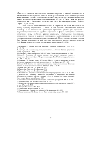 6. Дзуцева Н.В. Память как парадигма культуры в творческом сознании Вячеслава Иванова // Соловьевские исследования. 2009. Вып. 4(24). С. 40-46.