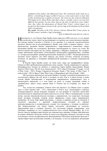 В данной статье будут рассмотрены фрагменты критических работ американского поэта Гарольда Харта Крейна (1899 - 1932). Цель нашей работы: продемонстрировать богатство эстетического опыта Крейна через призму его критических статей, то есть - отобазить специфику критического его наследия как критика и эссеиста. Задачи нашей работы заключаются в анализе конкретных эстетических воззрений поэта. Объектом данной статьи являются критические работы Крейна как зеркало современной ему эпохи. Предметом данной статьи является индивидуальная эстетическая позиция Крейна как критика. Актуальность данной статьи обусловлена крайне малой степенью исследованности рассматриваемого американского поэта в отечественной литературоведческой американистике. Ход исследования заключается в теоретической разработке рассматриваемого вопроса с позиции определения поэтики критического наследия Харта Крейна как такового, за которой следует практическое позитивное обоснование актуальности приведенных тезисов, в том числе и с позиции повлиявших на Крейна авторов. Выводы исследования таковы: рассмотрение наследия Харта Крейна как критика и эссеиста более чем достойно внимания по ряду причин. В работе использованы исследования Ричарда Уоррингтона Льюиса, Брома Уэбера и других, то есть научные источники не только разных временных отрезков, но и такие из них, которые являются основой американского крейноведения, поскольку отражают рассматриваемый феномен критического наследия Гарольда Харта Крейна в такой перспективе, которая остается актуальной и на нынешнем этапе развития рассматриваемой проблемы.