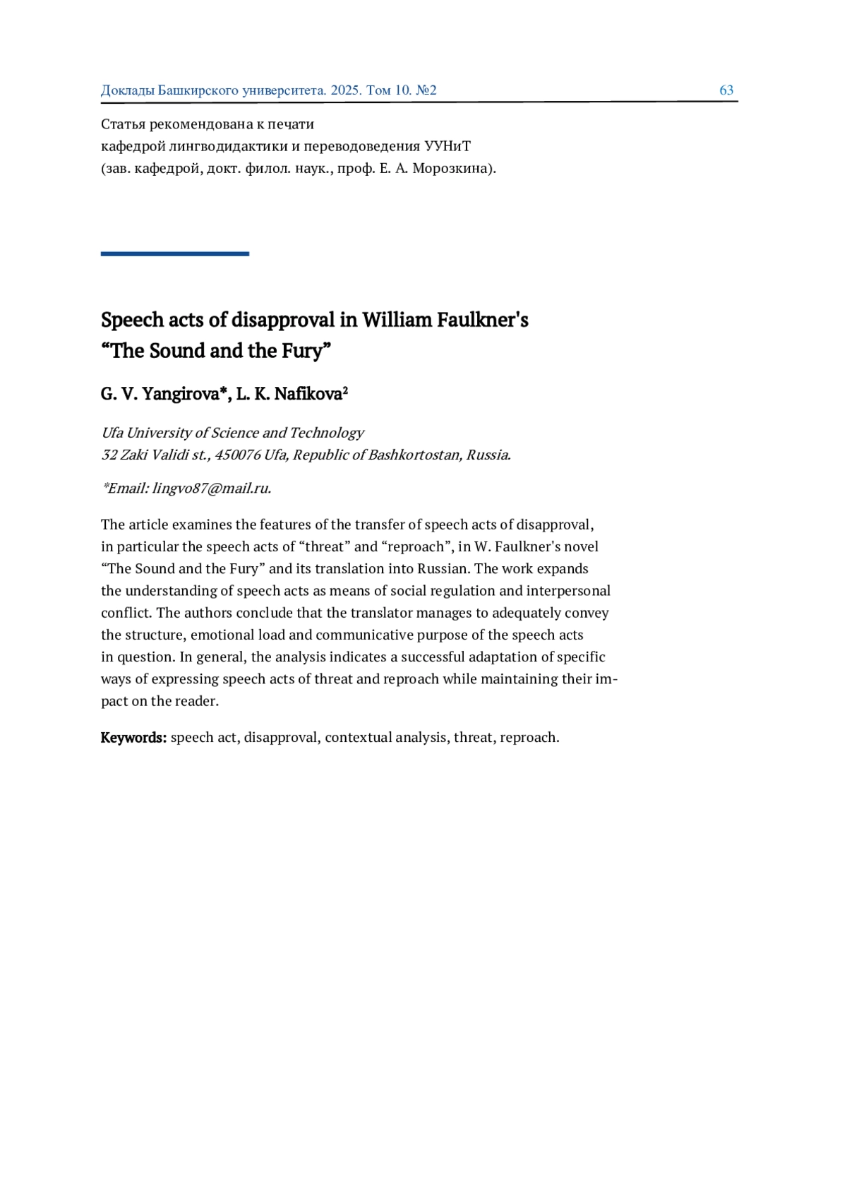 Статья: РЕЧЕВЫЕ АКТЫ НЕОДОБРЕНИЯ В РОМАНЕ У. ФОЛКНЕРА «ШУМ И ЯРОСТЬ» (2025)