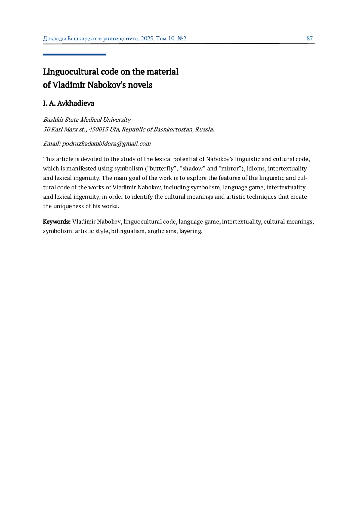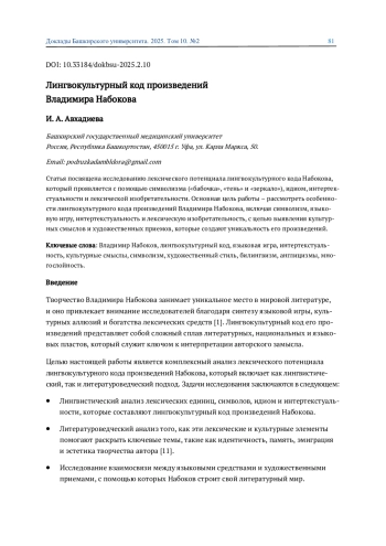 Творчество Владимира Набокова занимает уникальное место в мировой литературе, и оно привлекает внимание исследователей благодаря синтезу языковой игры, культурных аллюзий и богатства лексических средств [1]. Лингвокультурный код его произведений представляет собой сложный сплав литературных, национальных и языковых пластов, который служит ключом к интерпретации авторского замысла.