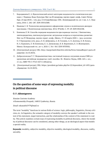 Термин «модальность» функционирует в различных областях науки: логике, философии, языкознании, литературоведении и др. В лингвистике семантическая категория модальности передает отношение говорящего к содержанию его высказывания, целевому наставлению, отношение содержания высказывания к действительности. В данной статье рассматриваются отдельные способы выражения модальности в политическом дискурсе, где модальность политического дискурса возможно рассматривать в т. ч. и как идеологический аспект, моделирующий особую реальность.
