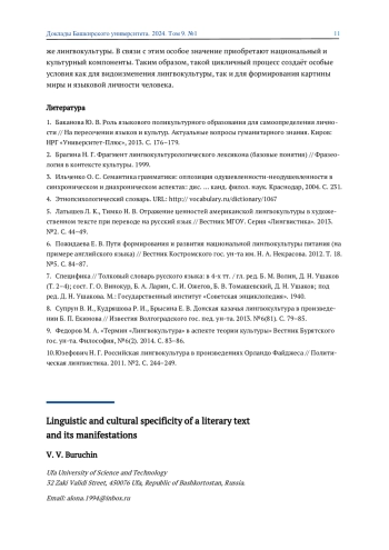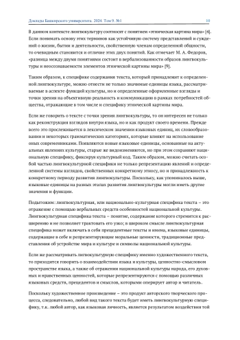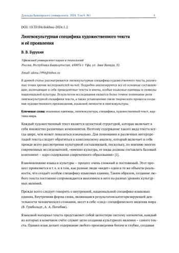 БУРУХИН В. В. ЛИНГВОКУЛЬТУРНАЯ СПЕЦИФИКА ХУДОЖЕСТВЕННОГО ТЕКСТА И ЕЁ ПРОЯВЛЕНИЯ // ДОКЛАДЫ БАШКИРСКОГО УНИВЕРСИТЕТА. 2024. Т. 9 № 1