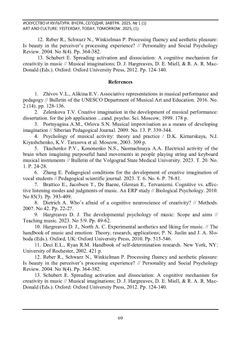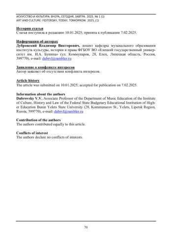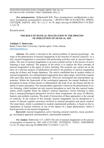 ДУБРОВСКИЙ В. В. РОЛЬ МУЗЫКАЛЬНОГО ВООБРАЖЕНИЯ В ПРОЦЕССЕ ВОСПРИЯТИЯ МУЗЫКАЛЬНОГО ИСКУССТВА // ИСКУССТВО И КУЛЬТУРА: ВЧЕРА, СЕГОДНЯ, ЗАВТРА. 2025. № 1 (1)