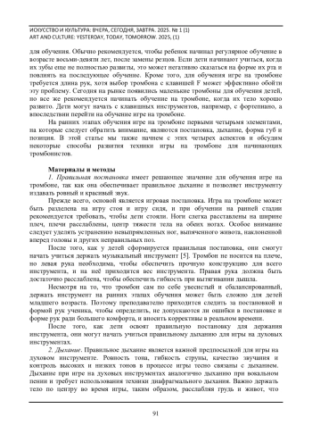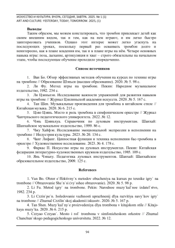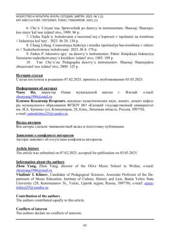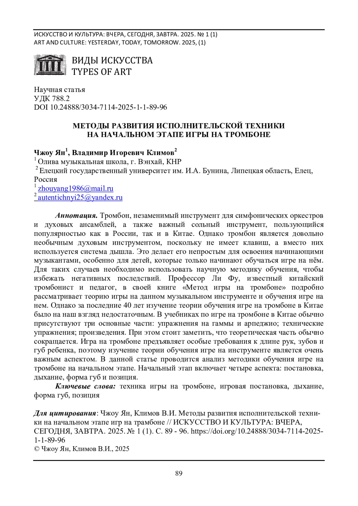 ЧЖОУ Я., КЛИМОВ В. И. МЕТОДЫ РАЗВИТИЯ ИСПОЛНИТЕЛЬСКОЙ ТЕХНИКИ НА НАЧАЛЬНОМ ЭТАПЕ ИГРЫ НА ТРОМБОНЕ // ИСКУССТВО И КУЛЬТУРА: ВЧЕРА, СЕГОДНЯ, ЗАВТРА. 2025. № 1 (1)