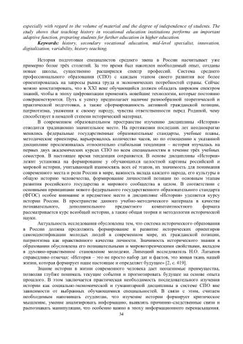 История подготовки специалистов среднего звена в России насчитывает уже примерно более трѐх столетий. За это время был накоплен необходимый опыт, созданы новые школы, существенно расширился спектр профессий. Система среднего профессионального образования (СПО) с каждым этапом своего развития все более ориентировалась на запросы рынка труда и экономических потребностей страны. Сейчас можно констатировать, что в XXI веке обучающийся должен обладать широким спектром знаний, чтобы в эпоху цифровизации применять новейшие технологии, которые постоянно совершенствуются. Путь к успеху предполагает наличие разнообразной теоретической и практической подготовки, а также сформированность активной гражданской позиции, патриотизма, уважения к своему народу, чувства ответственности перед Родиной, чему способствует в немалой степени исторический материал.
