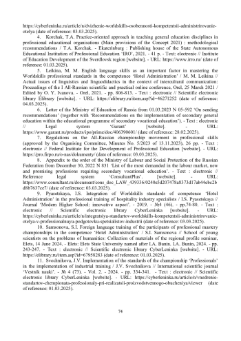 1. Бацына, Я.В. Подготовка студентов к демоэкзамену по стандартам “Worldskills Russia” по компетенции “Администрирование отеля” / Я.В. Бацына, Н.А. Белоусова, Е.Ю. Саляева // Журнал “Проблемы современного педагогического образования”. - 2022. - №74-1. - С. 34-37. - Текст: электронный // Научная электронная библиотека КиберЛенинка [сайт]. - URL: https://cyberleninka.ru/article/n/podgotovka-studentov-k-demoekzamenu-po-standartam-worldskills-russia-po-kompetentsii-administrirovanie-otelya (дата обращения: 03.03.2025).