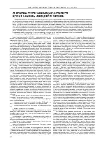 ДИБИРОВ И. А., БИДАНОК М. М. ОБ АВТОРСКОМ ОТКРОВЕНИИ И ОФОРМЛЕННОСТИ ТЕКСТА В РОМАНЕ Б. ШИНКУБЫ «ПОСЛЕДНИЙ ИЗ УШЕДШИХ» // МИР НАУКИ, КУЛЬТУРЫ, ОБРАЗОВАНИЯ. 2025. № 1 (110)