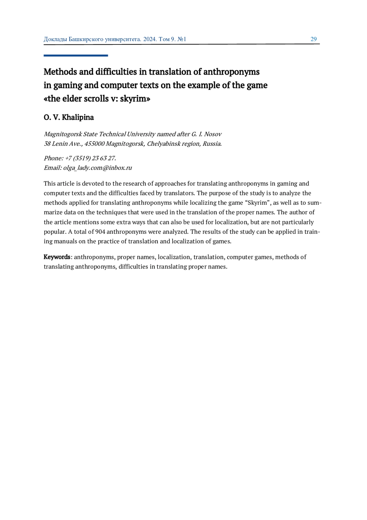 Данная статья посвящена исследованию способов перевода антропонимов в текстах игровой и компьютерной направленности и сложностей, с которыми сталкиваются переводчики. Целью исследования является анализ методов перевода антропонимов при локализации игры «Скайрим», а также обобщение данных о приемах, которые были использованы при переводе имен собственных. В статье упоминаются методы, которые тоже могут применяться при локализации, но не имеют особой популярности. Всего было проанализировано 904 антропонима. Сфера применяемости результатов - обучающие пособия по практике перевода и локализации игр.