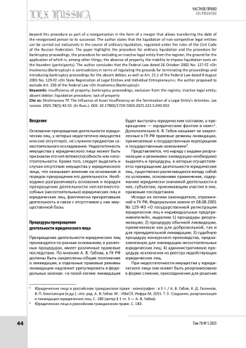 В статье исследуются основания и порядок прекращения деятельности юридических лиц, у которых недостаточно имущества для удовлетворения требований кредиторов, т. е. находящихся в состоянии финансового кризиса. Разграничены состояния неплатежеспособности (несостоятельности) и отсутствия имущества у юридических лиц, влекущие разные правовые последствия при прекращении их деятельности. Признано, что прекращение деятельности неплатежеспособных (несостоятельных) юридических лиц в процедуре несостоятельности зависит от наличия у них конкурсоспособности как предпосылки введения процедуры, способности их к санации, возможности финансирования процедуры заинтересованными кредиторами. Сделан вывод о возможности прекращения деятельности юридического лица в ходе процедуры несостоятельности или вне этой процедуры, в рамках реорганизации в форме присоединения (слияния), позволяющей передать задолженность реорганизуемого лица его правопреемнику. Установлено, что ликвидация неконкурсоспособных юридических лиц может быть произведена исключительно в ходе обычной ликвидации, регулируемой ГК РФ. Выделены процедура обычной ликвидации и процедура конкурсного производства, а также процедура исключения из реестра недействующего юридического лица, основанием применения которой служат в том числе отсутствие имущества, невозможность возложить расходы по ликвидации на учредителей (участников). Сделан вывод о противоречивости Федерального закона от 26.10.2002 № 127-ФЗ «О несостоятельности (банкротстве)» в части регулирования оснований прекращения производства по делу и введения процедуры банкротства отсутствующего должника, а также ст. 21.1 Федерального закона от 08.08.2001 № 129-ФЗ «О государственной регистрации юридических лиц и индивидуальных предпринимателей»; предложено исключить ст. 230 Федерального закона «О несостоятельности (банкротстве)».