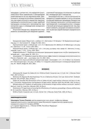 ШИШМАРЕВА Т. П. ВЛИЯНИЕ НЕДОСТАТОЧНОСТИ ИМУЩЕСТВА НА ПРЕКРАЩЕНИЕ ДЕЯТЕЛЬНОСТИ ЮРИДИЧЕСКОГО ЛИЦА // LEX RUSSICA (РУССКИЙ ЗАКОН). 2025. ТОМ 78, № 5