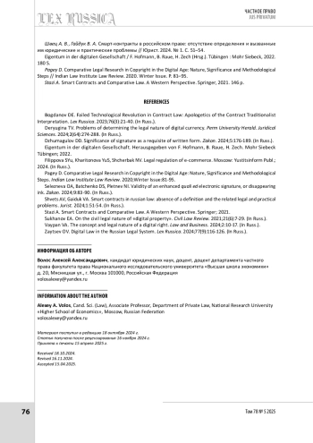 9. Швец А. В., Гайдук В. А. Смарт-контракты в российском праве: отсутствие определения и вызванные им юридические и практические проблемы // Юрист. 2024. № 1. С. 51-54.