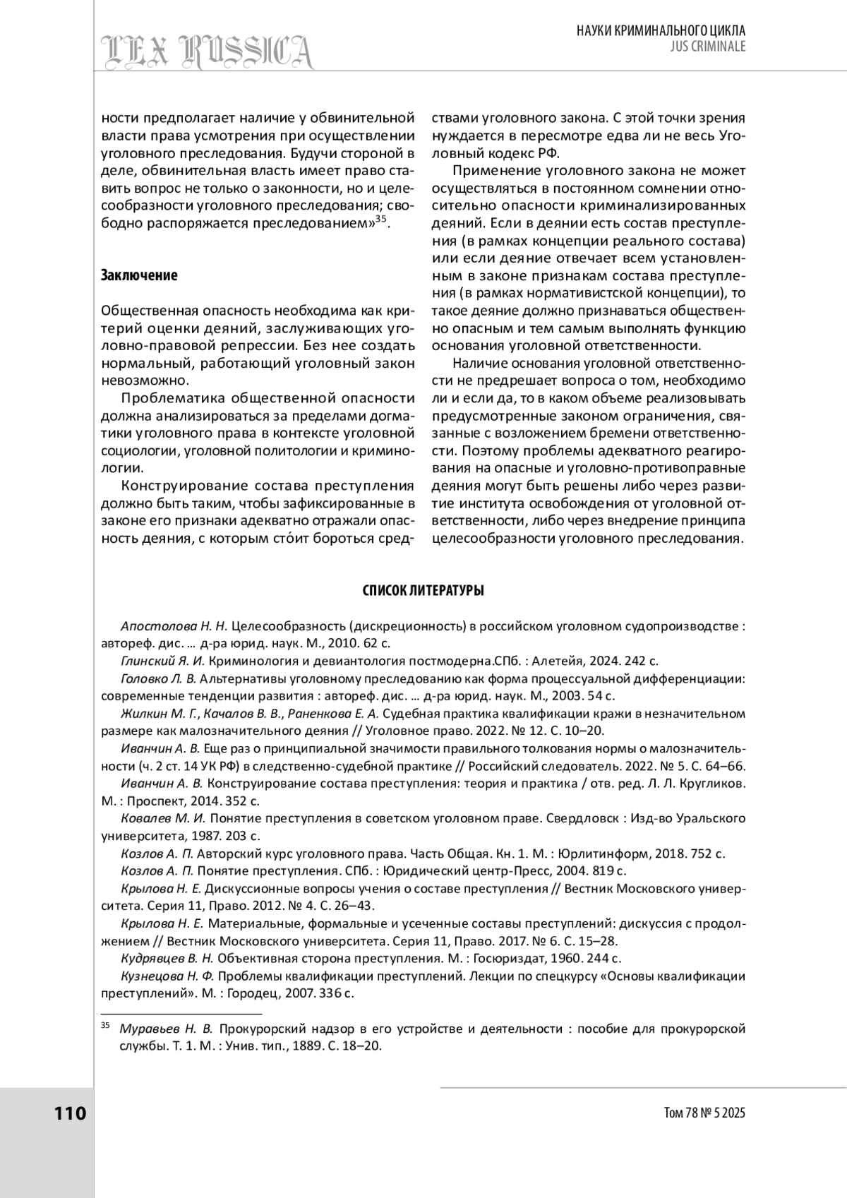 15. Лопашенко Н. А. Общественная опасность деяния: верификация невозможна? // Актуальные проблемы российского права. 2024. T. 19. № 8. С. 127-138.