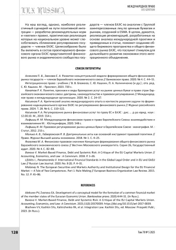 1. Алексеев П. В., Звонова Е. А. Развитие концептуальной модели формирования общего финансового рынка государств - членов Евразийского экономического союза // Банковское право. 2020. № 4. С. 44-51.