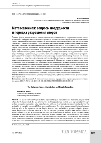 В статье рассматриваются юрисдикционные аспекты разрешения споров, возникающих в метавселенной — цифровом мире, ключевые особенности которого включают в себя: использование иммерсивных технологий (виртуальная реальность); представление пользователей через аватары; проведение транзакций с помощью блокчейна; существование централизованных и децентрализованных платформ; наличие в коммерческом обороте нематериализованных активов и NFT. Автор приводит классификацию споров, которые могут возникнуть в метавселенной: споры между пользователями и операторами платформ; споры между пользователями; споры по поводу интеллектуальной собственности. В первой категории автор особенно выделяет правовые конфликты, касающиеся виртуальной недвижимости, а также споры по поводу персональных данных пользователей платформ, операторы которых не могут гарантировать защиту от хакерских атак. Касательно споров между пользователями автор отмечает, что многие из них связаны с отсутствием в метавселенной какого-либо контроля за оказанием виртуальных услуг, созданием цифровых активов и совершением транзакций. Обращаясь к вопросу о применимом праве и подсудности, автор указывает, что в большинстве случаев соответствующие положения включаются в пользовательские соглашения отдельных платформ и не подлежат изменению. В статье рассмотрены три инструмента разрешения споров, возникающих в метавселенной: «традиционный» — в государственных судах или в рамках арбитража; «модифицированный», где правила судопроизводства адаптируются к специфике виртуальных правоотношений, и «децентрализованный» — в рамках онлайн-урегулирования споров, сочетающий в себе элементы блокчейна, краудсорсинга и искусственного интеллекта.