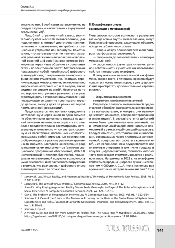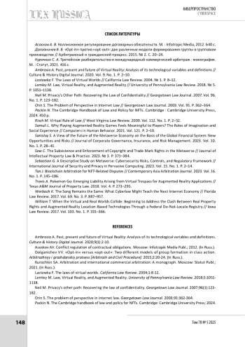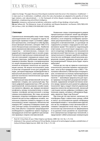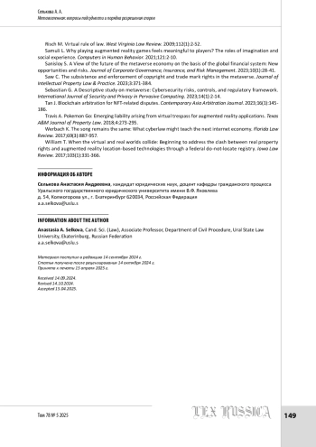 СЕЛЬКОВА А. А. МЕТАВСЕЛЕННАЯ: ВОПРОСЫ ПОДСУДНОСТИ И ПОРЯДКА РАЗРЕШЕНИЯ СПОРОВ // LEX RUSSICA (РУССКИЙ ЗАКОН). 2025. ТОМ 78, № 5