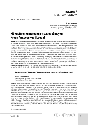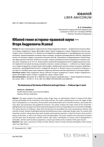 В статье анализируется творческий путь Игоря Андреевича Исаева — авторитетного ученого в области истории государства и права, философии права, теории государства и права. Предпринята попытка проследить этапы становления И. А. Исаева как исследователя, формирование и трансформацию его научных интересов, проанализированы основные идеи и выводы, которыми руководствовался юбиляр. Предложен анализ его основных трудов с указанием ключевых мыслей, повлиявших на формирование соответствующих сфер научного познания. Отмечены его идеи, ставшие основой для многих современных теорий и научных школ. Несмотря на то что И. А. Исаев прошел непростой преподавательский и профессиональный путь, его творческий пытливый ум всегда занимали сложные и важные вопросы — в области как теории права, так и теории государства, истории права и философии. Наибольший научный интерес вызывали проблемы, связанные с взаимодействием власти и государства. Вклад И. А. Исаева в науку и ее развитие неоценим, и как один из способов отдать дань уважения творчеству великого мастера подготовлена настоящая работа.