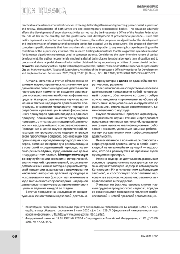 В статье рассмотрены вопросы организации и проведения прокурорских проверок, представлены результаты авторских исследований, посвященных основам тактики надзорной деятельности прокуратуры. Тактика разрабатывается для достижения целей и выполнения задач каждой надзорной стадии, а в ходе данного процесса выявляются проблемы, связанные с надзорной деятельностью. Анализ научных и практических источников привел к обнаружению несовершенства нормативного правового регулирования надзорной деятельности прокуратуры, характерного для органов прокуратуры советского и современного периодов. Такое положение дел негативно влияет на развитие надзорной деятельности органов прокуратуры РФ, уровень состояния законности в государстве и совершенствование профессиональных навыков прокурорских работников. Поскольку тактика является одним из главных факторов повышения эффективности, автором предложен к использованию в практической деятельности прокуроров алгоритм разработки и реализации тактики надзорной деятельности прокуратуры. В содержание предложенного алгоритма входят конкретные элементы, формирующие универсальную конструкцию по их использованию на любой из надзорных стадий в зависимости от условий надзорной ситуации. Результаты исследования показали, что указанный алгоритм реализуется по принципу основных алгоритмических конструкций в информатике. Ввиду трудоемкости процесса разработки тактики автор предлагает использовать для этого цифровые технологии, что позволит более рационально распределять рабочее время, обрабатывать и хранить в органах прокуратуры бо́льшие объемы информации, полученной при осуществлении надзорной деятельности.