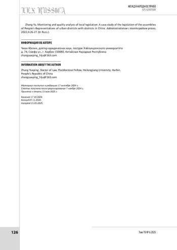 12. Чжан Ю. Мониторинг и анализ качества местного законодательства: тематическое исследование законодательства собраний народных представителей городских округов, имеющих районы в Китае // Административное и муниципальное право. 2022. № 4. С. 25-30.