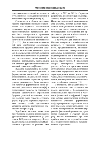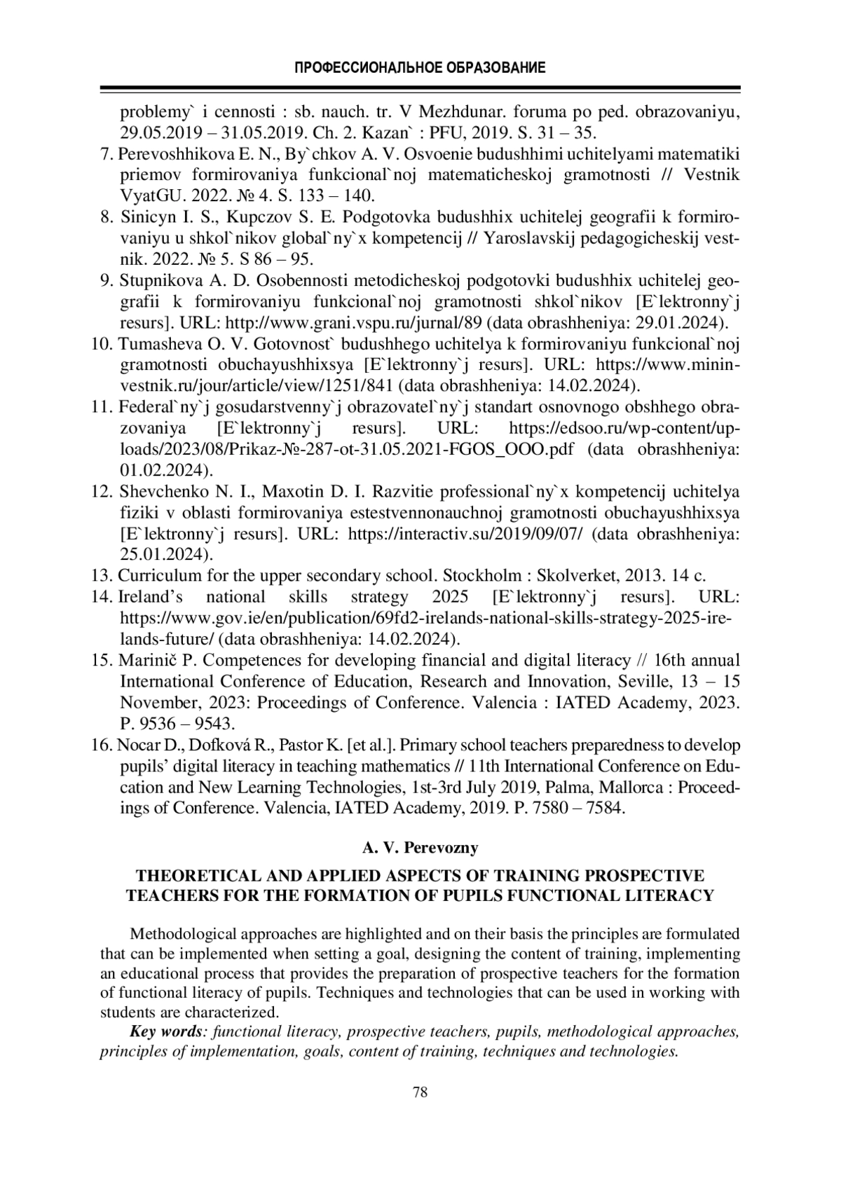 7. Перевощикова Е. Н., Бычков А. В. Освоение будущими учителями математики приемов формирования функциональной математической грамотности // Вестник ВятГУ. 2022. № 4. С. 133 - 140.