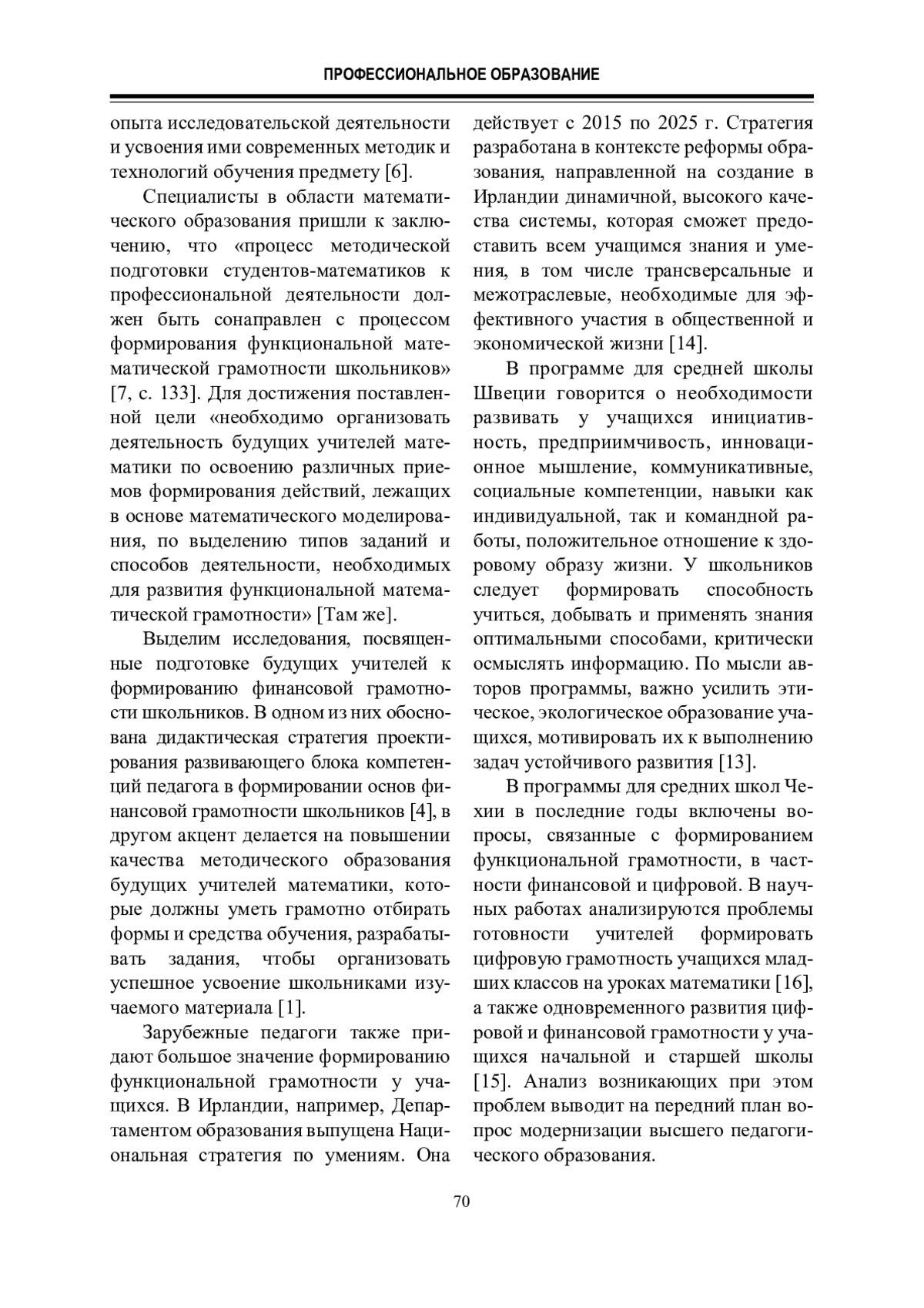 1. Авдеева Т. И., Высокос М. И. Подготовка студентов к деятельности по формированию финансовой грамотности школьников при обучении математике // Проблемы современного педагогического образования. 2022. № 77 - 2. С. 14 - 17.