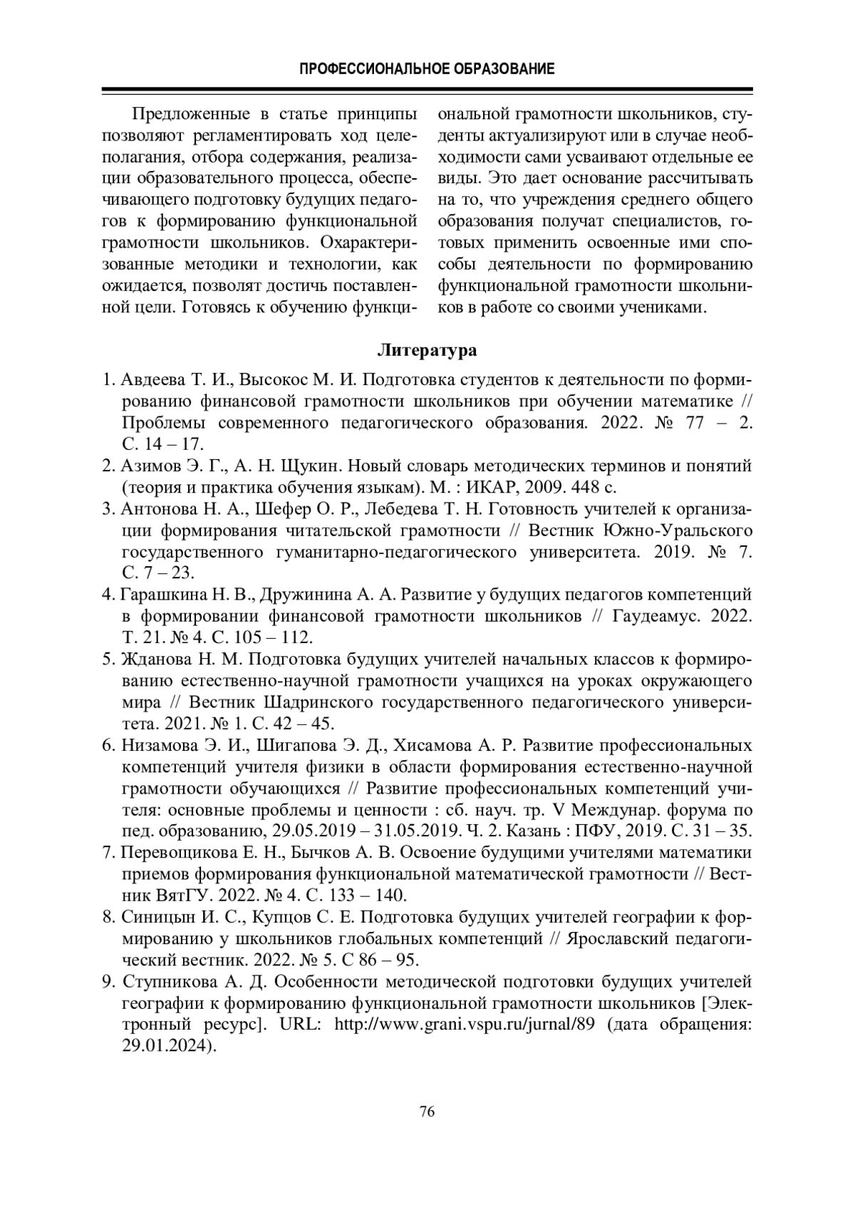 9. Ступникова А. Д. Особенности методической подготовки будущих учителей географии к формированию функциональной грамотности школьников [Электронный ресурс]. URL: http://www.grani.vspu.ru/jurnal/89 (дата обращения: 29.01.2024).