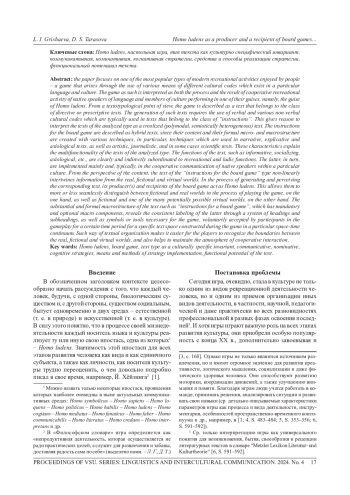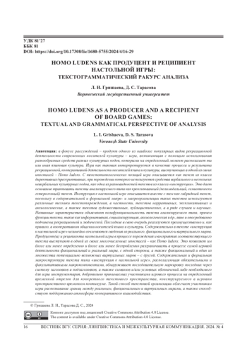 В фокусе рассуждений - продукт одного из наиболее популярных видов рекреационной деятельности современных носителей культуры - игра, возникающая с помощью использования разнообразных средств разных культурных кодов, которыми на определенный момент располагает та или иная языковая культура. Игра как таковая интерпретируется в качестве процесса и результата рекреационной, кооперативной деятельности носителей языка и культуры, выступающих в одной из своих ипостасей - Homo ludens. С текстотипологических позиций игра описывается как текст из класса директивных/прескриптивных, при порождении которого используются средства вербального и нескольких невербальных культурных кодов, как одна из разновидностей текстов из класса «инструкции». Это дает основание трактовать тексты анализируемого типа как креолизованный (полимодальный, семиотически гетерогенный) текст. Инструкция к настольной игре описывается вместе с тем как гибридный текст, поскольку в содержательной и формальной микро- и макроорганизации таких текстов используются различные техники текстопорождения, в частности, текстов нарративных, экспликативных и аксиологических, а также текстов художественных, публицистических, а в ряде случаев и научных. Названные характеристики объясняют полифункциональность текста анализируемого типа, причем функции текста, такие как информативная, социализирующая, аксиологическая и др., явно и опосредованно подчинены рекреационной и людической. Последние в свою очередь реализуются преимущественно и, как правило, в кооперативном общении носителей языка и культуры. Содержательно в тексте «инструкция к настольной игре» нелинейно сочленяются сведения из реального, фикционального и виртуального миров. Продуцент(ы) и реципиенты настольной игры в процессе порождения и восприятия соответствующего текста выступают в одной из своих многочисленных ипостасей - как Homo ludens. Это позволяет им более или менее определенно и более или менее беспроблемно разграничивать в процессе самой игровой деятельности фикциональный и реальный миры, с одной стороны, а также фикциональный и один из множества потенциально возможных виртуальных миров - с другой. Содержательная и формальная макроструктура текста типа «инструкция к настольной игре», располагающая обязательными и факультативными макрокомпонентами, обнаруживает последовательную маркировку последних через систему заголовков и подзаголовков, а также символов и/или условных обозначений либо необходимого для игры инструментария, добровольно принимаемых участниками игрового процесса на определенный временной отрезок для конкретного текстового пространства, конструируемого в игровом пространственно-временном континууме. Такой способ текстовой организации облегчает участникам игры распознавание границ между реальным, фикциональным и виртуальным мирами, а также способствует поддержанию атмосферы кооперативного взаимодействия.