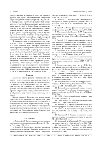 Данная статья посвящена такому комплексному явлению, как фонетическая вариантность идиом. Вариантность как таковая проявляется в существовании идиом, которые настолько близки в плане выражения и плане содержания, что при определенных условиях могут считаться разновидностями одной и той же единицы. Фонетическая вариантность - это системно-языковое изменение фонетического облика компонентов идиомы. Фонетические варианты делятся на произносительные и акцентологические. В первом случае изменяется фонетический облик компонентов, во втором - только постановка ударения. Акцентологические варианты являются результатом изменения исходного ударения и имеют различную природу: в одних случаях вариантность ударения обусловлена историческим развитием, в других -стилистической дифференциацией, разграничением литературного языка и диалектов, в третьих -ритмом и рифмой. В произносительных вариантах идиомы компоненты могут оставаться прежними или заменяться на созвучные. Обычно омонимия (омофония) в фонетических вариантах не встречается, однако благодаря ритму и рифме могут сохраняться омографы, ср. гол как сокол ‘находящийся в состоянии крайней бедности ’, в которой сокол, как правило, интерпретируется не как вариант ударения слова сокол, а как омоним. Фонетическая вариантность может совмещаться с лексической и морфологической, причем лексико-фонетические произносительные варианты идиом часто являются стилистически маркированными и возникают в результате ослышки или эвфемизации. Именно эти варианты традиционно рассматривались как собственно фонетические, хотя, очевидно, фонетическая вариантность ими не ограничивается. В рамках фонетической вариантности представлены варианты диахронические, стилистические (литературный языку», диалект, просторечие), дискурсивные (ср. изменение акцентуации в поэзии). Фонетические акцентологические варианты обусловленыупорядоченностью и симметрией, которая встречается как у пословиц, так и идиом.