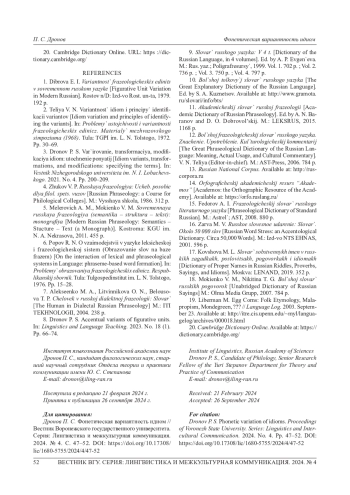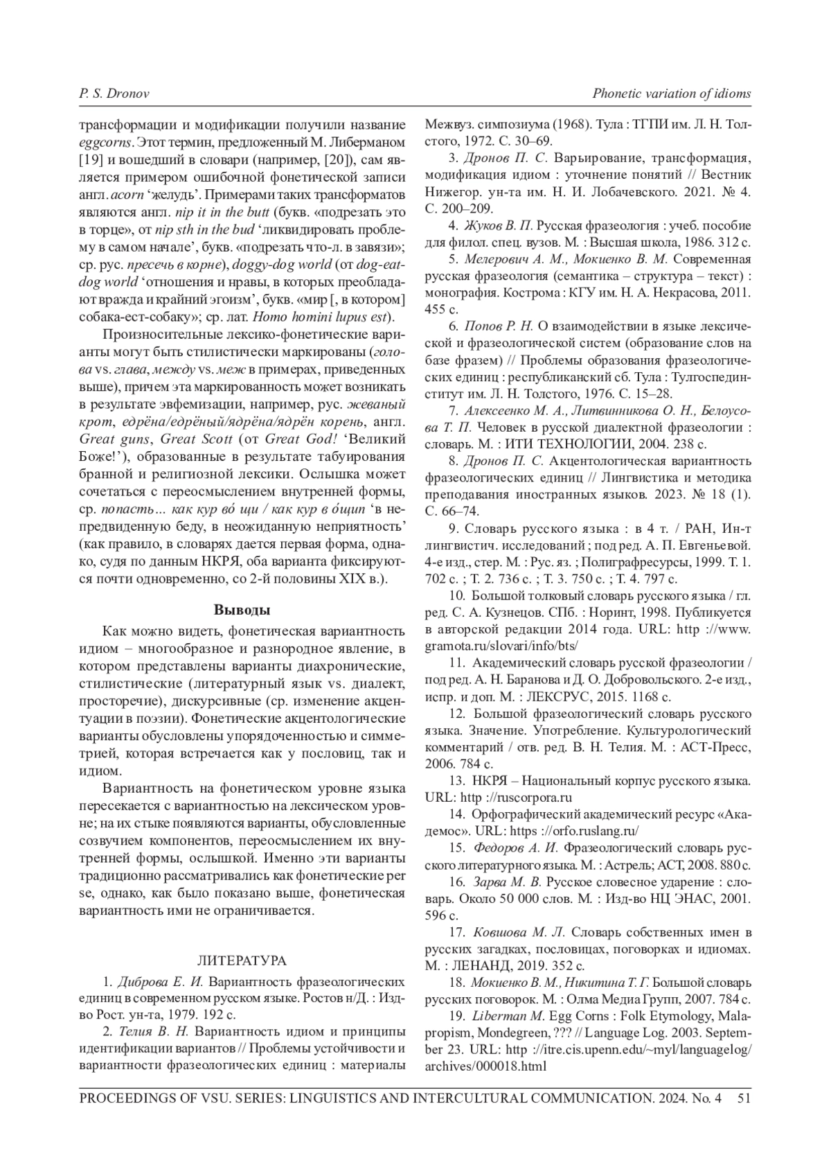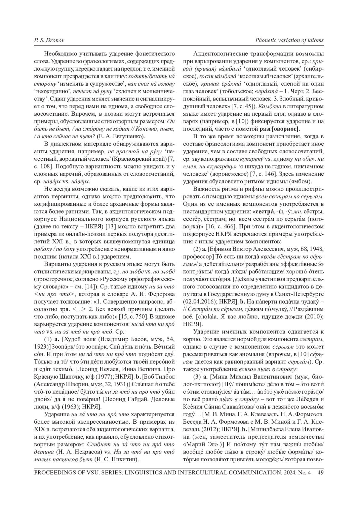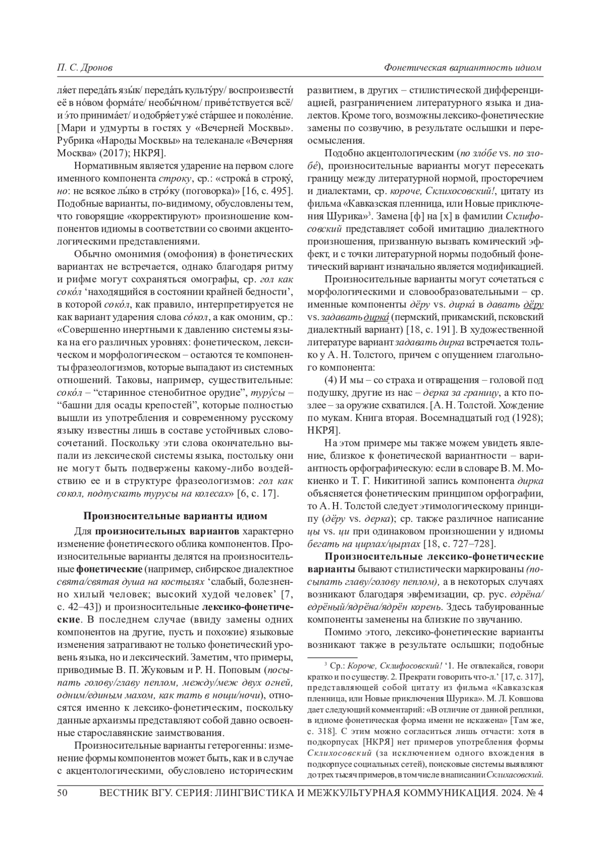 ДРОНОВ П. С. ФОНЕТИЧЕСКАЯ ВАРИАНТНОСТЬ ИДИОМ // ВЕСТНИК ВОРОНЕЖСКОГО ГОСУДАРСТВЕННОГО УНИВЕРСИТЕТА. СЕРИЯ: ЛИНГВИСТИКА И МЕЖКУЛЬТУРНАЯ КОММУНИКАЦИЯ. 2024. № 4
