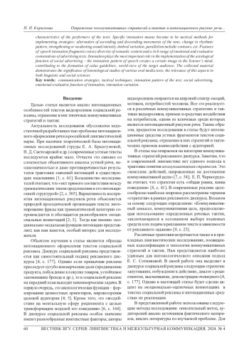 Статья посвящена интонационному оформлению текстов социальной рекламы. Целью работы является анализ интонационных особенностей рекламных видеороликов, отражение в них типичных коммуникативных стратегий и тактик. С помощью аудиторского анализа источников, использования интонационной транскрипции описаны актуальные в современныхмедиаресурсахустные фрагменты текстов социальной рекламы. На основе исследования сделаны выводы, что в социальной рекламе в российских СМИ наиболее частотной является стратегия побуждения к действию. Встречается также запугивание, демонстрация очевидного, стратегия коммуникативного сотрудничества с аудиторией и др. Интонационное оформление роликов во всех случаях предельно точно отражает стратегическую направленность коммуникативного замысла рекламодателей; кроме того, оно может варьироваться в зависимости от индивидуальных особенностей исполнителей текстов. Специфические интонационные средства становятся тактическими приемами реализации стратегий: чередование восходящих и нисходящих движений тона, изменение ритмического рисунка, усиление или ослабление интенсивности звучания, тембральное варьирование, параллелизм мелодических контуров и др. Особенности интонирования речевых фрагментов передают разнообразие смыслового содержания и богатый спектр эмоциональнооценочных коннотаций рекламных текстов. Важнейшую роль играет интонация в реализации аксиологической функции социальной рекламы - интонационный рисунок речи создает определенный образ в сознании слушателя, способствующий формированию ценностных ориентиров, мировоззрения целевой аудитории. Собранный материал свидетельствует о значимости в современных реалиях интонологических исследований различныхустных текстов СМИ, актуальности данного аспекта как в лингвистических, так и в социальных науках.