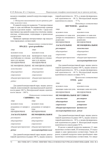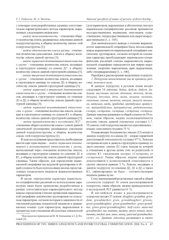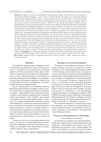 Статья посвящена выявлению национальной специфики одной из базовых лексических группировок русского и английского языков - наименований лиц по прямому родству. Авторы ставят целью выявить национальную специфику данной группировки с двух позиций - при помощи сопоставительного и контрастивного анализа. В качестве гипотезы исследования была выдвинута мысль, что выводы о степени выраженности национальной специфики исследуемых группировок, сделанные на основании сопоставительного и контрастивного анализа, будут одинаковыми. Материалом исследования послужили субстантивные лексемы русского и английского языков, обозначающие наименования лиц по прямому родству и извлеченные методом сплошной выборки из авторитетных лексикографических источников русского и английского языков. Исследование проведено с помощью двух основных процедур разрабатываемого в рамках Воронежской теоретико-лингвистической школы сопоставительнопараметрического метода лингвистических исследований: индексализации параметров исследования и шкалирования полученных результатов. Для сопоставительного анализа исследуемой группы были использованы семь разработанных в рамках сопоставительно-параметрического метода параметров, выраженных следующими индексами: индекс полисемантичности, индекс однозначности лексем группы, индекс первичной денотативной отнесенности к группе, индекс вторичной денотативной отнесенности к группе, индекс первичной и вторичной денотативной отнесенности к группе, индекс первичной коннотативной отнесенности к группе, индекс принадлежности к исследуемой ЛСГ, а также введенный авторами индекс первичной денотативной и коннотативной отнесенности к группе. Для анализа контрастивных пар были использованы введенные в рамках сопоставительнопараметрического метода индексы денотативной, коннотативной и функциональной идентичности лексем, а также интегральный индекс идентичности лексем. Применение данных индексов и соответствующих шкал, а также предложенной авторами шкалы выраженности национальной специфики контрастивных пар позволило сделать вывод о неярко выраженной национальной специфике изученной группировки и подтвердило гипотезу исследования о том, что выводы о степени выраженности национальной специфики исследуемых группировок, сделанные на основании сопоставительного и контрастивного анализа, окажутся одинаковыми.