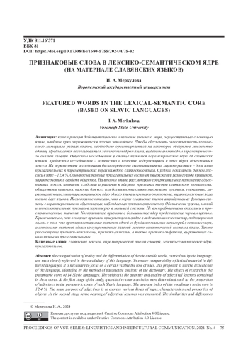 МЕРКУЛОВА И. А. ПРИЗНАКОВЫЕ СЛОВА В ЛЕКСИКО-СЕМАНТИЧЕСКОМ ЯДРЕ (НА МАТЕРИАЛЕ СЛАВЯНСКИХ ЯЗЫКОВ) // ВЕСТНИК ВОРОНЕЖСКОГО ГОСУДАРСТВЕННОГО УНИВЕРСИТЕТА. СЕРИЯ: ЛИНГВИСТИКА И МЕЖКУЛЬТУРНАЯ КОММУНИКАЦИЯ. 2024. № 4