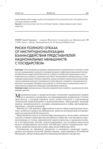 Статья посвящена исследованию межнациональных и межрелигиозных отношений, а также их роли в провоцировании конфликтов. Анализируется важность эффективной национальной политики для обеспечения государственной безопасности, особенно в условиях многонационального и многоконфессионального общества, характерного для России. Рассматриваются ключевые факторы, способствующие возникновению этнических конфликтов, включая когнитивно-психологические катализаторы, такие как нежелание мигрантов интегрироваться в новое общество и предвзятое отношение местного населения к иностранцам. Обсуждается роль диаспор, их положительные и отрицательные аспекты, а также значение справедливого правосудия в урегулировании конфликтов.