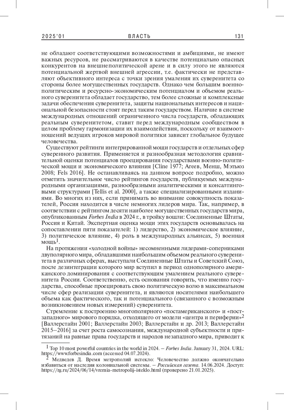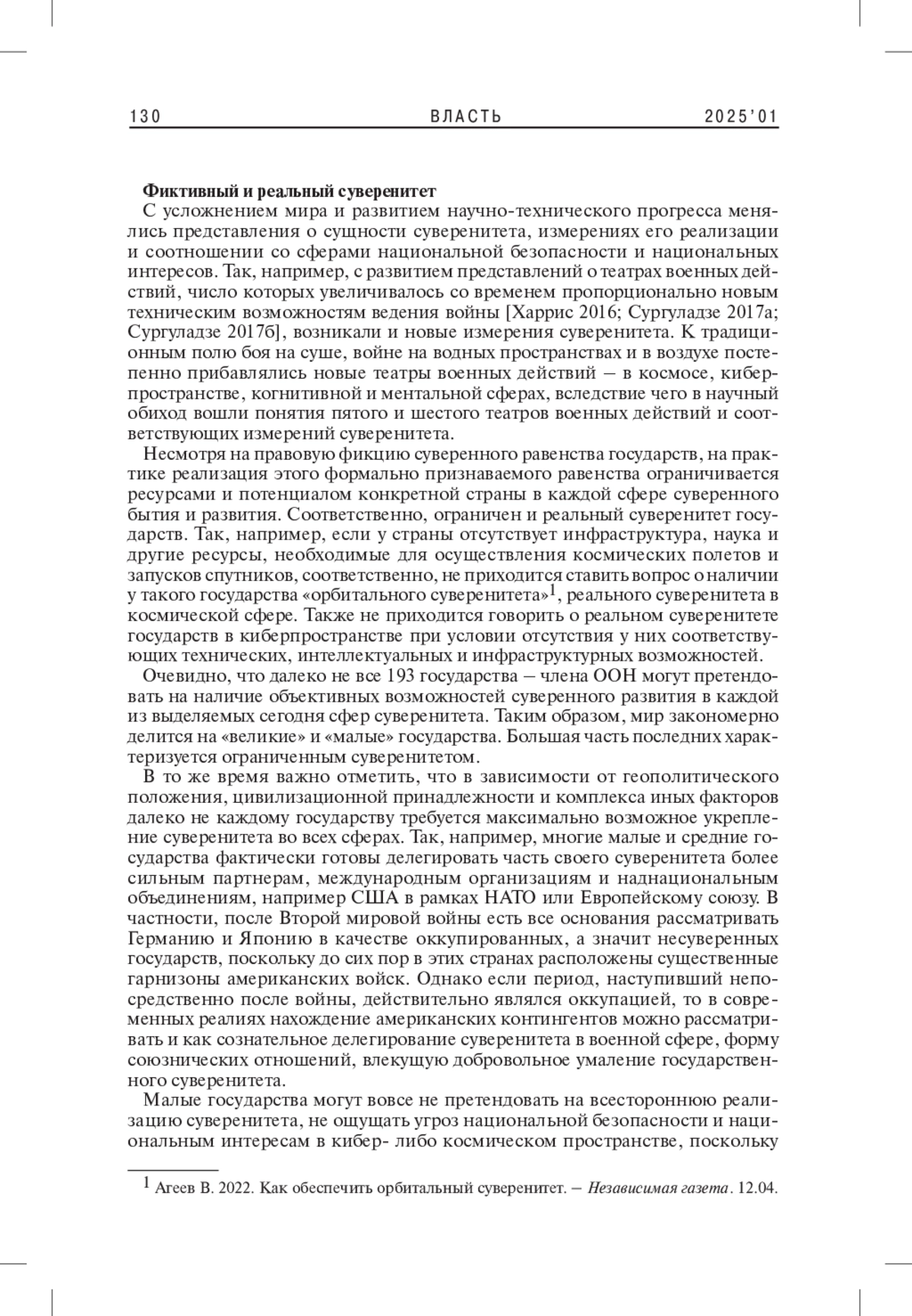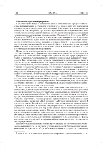 В статье рассматривается проблематика фактического неравенства объемов суверенитета национальных государств при их формальном равенстве в соответствии с принципами международного права. Очерчиваются различия между фиктивным и реальным суверенитетом, приводятся примеры глобалистских концепций ограничения суверенитета национальных государств, призванных закрепить гегемонию Соединенных Штатов и коллективного Запада на международной арене. Характеризуется роль России в качестве государства, отстаивающего в международных делах сложившиеся принципы суверенитета. Подчеркивается ключевое значение национально-государственной и геополитической идентичности для обеспечения суверенитета, защиты национальных интересов и национальной безопасности. Делается вывод о возросшей актуальности изучения сущности суверенитета в условиях процессов деглобализации и формирования полицентричного мирового порядка, основными движущими силами которого выступают Россия и Китай.