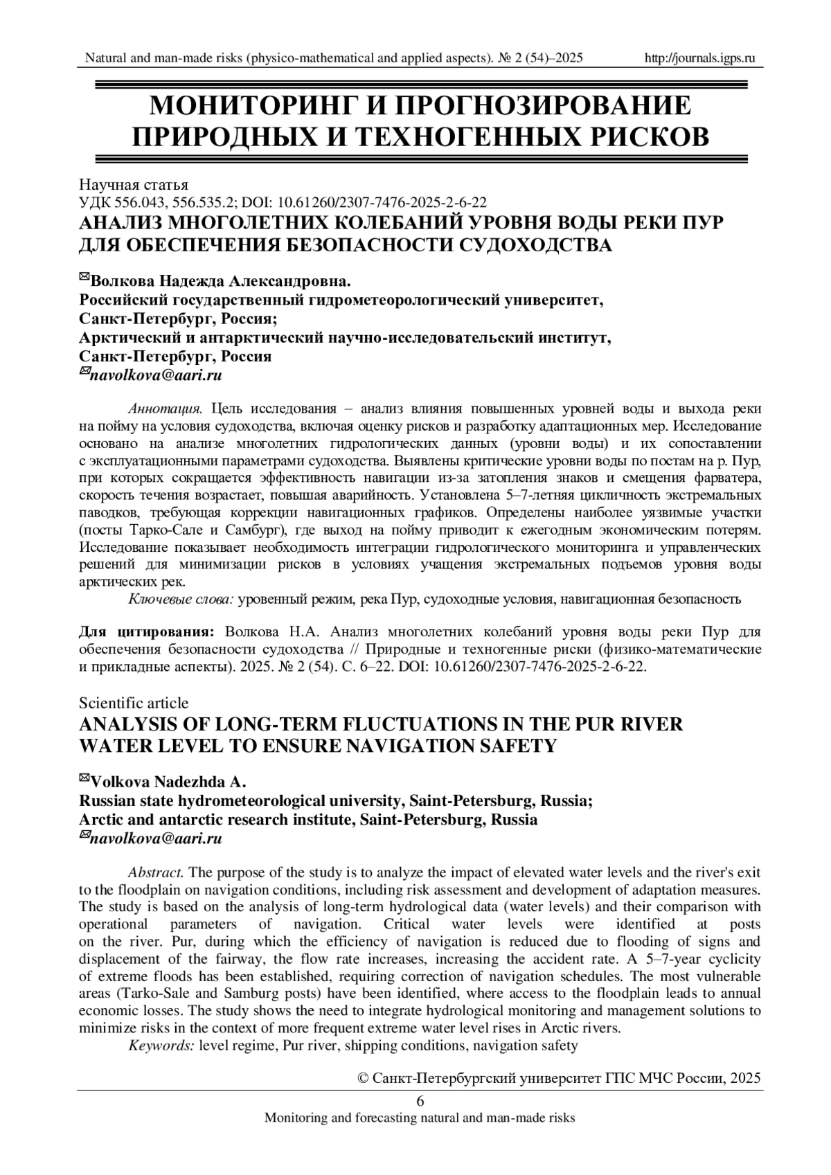 Цель исследования – анализ влияния повышенных уровней воды и выхода реки на пойму на условия судоходства, включая оценку рисков и разработку адаптационных мер. Исследование основано на анализе многолетних гидрологических данных (уровни воды) и их сопоставлении с эксплуатационными параметрами судоходства. Выявлены критические уровни воды по постам на р. Пур, при которых сокращается эффективность навигации из-за затопления знаков и смещения фарватера, скорость течения возрастает, повышая аварийность. Установлена 5–7-летняя цикличность экстремальных паводков, требующая коррекции навигационных графиков. Определены наиболее уязвимые участки (посты Тарко-Сале и Самбург), где выход на пойму приводит к ежегодным экономическим потерям. Исследование показывает необходимость интеграции гидрологического мониторинга и управленческих решений для минимизации рисков в условиях учащения экстремальных подъемов уровня воды арктических рек.
