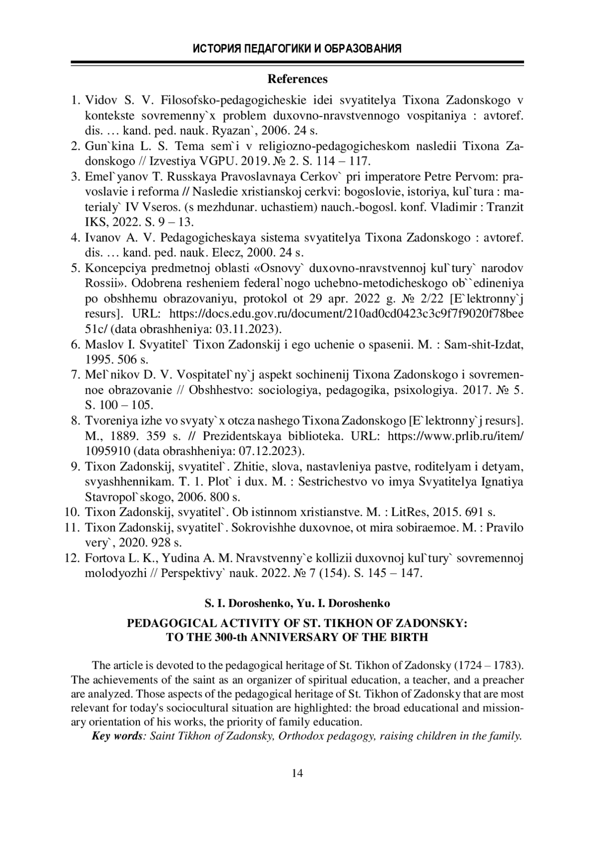 4. Иванов А. В. Педагогическая система святителя Тихона Задонского : автореф. дис. … канд. пед. наук. Елец, 2000. 24 с.