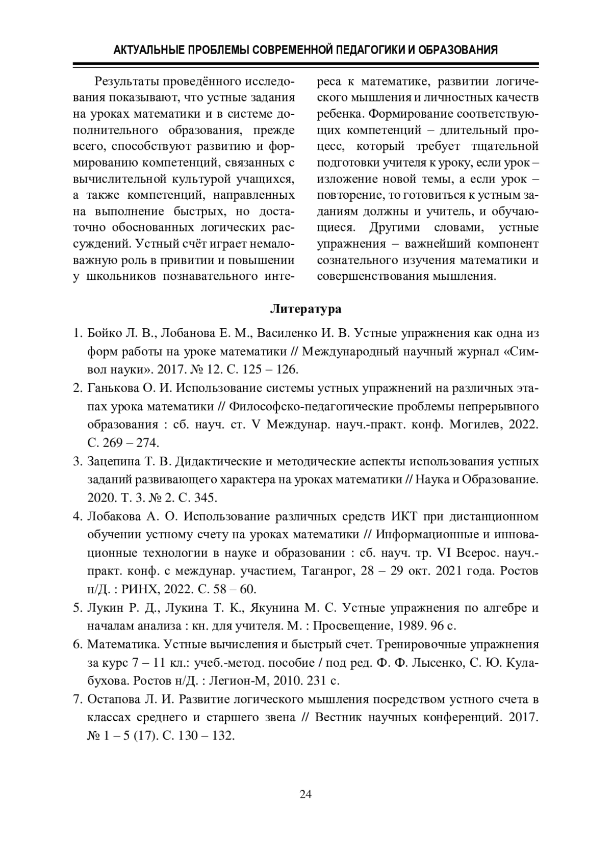 1. Бойко Л. В., Лобанова Е. М., Василенко И. В. Устные упражнения как одна из форм работы на уроке математики // Международный научный журнал «Символ науки». 2017. № 12. С. 125 - 126.