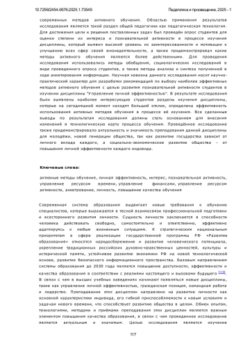 В научной статье рассматривается опыт применения активных методов обучения в процессе преподавания дисциплины «Управление личной эффективностью» для студентов первого курса Читинского института Байкальского государственного университета. Объектом исследования стало изучение технологии обучения студентов управлению личной эффективностью, что включало в себя разработку и апробацию последовательности применения психолого-педагогических приёмов и методов, встраиваемых в технологическую карту прохождениями основных разделов изучения данной дисциплины. Предметом исследования стало применение методов активного обучения в процессе изучения данной дисциплины. Целью исследования является изучение познавательной активности студентов под воздействием применения современных методов активного обучения. Областью применения результатов исследования является такой раздел общей педагогики как педагогическая технология. Для достижения цели и решения поставленных задач был проведён опрос студентов для оценки степени их интереса и познавательной активности в процессе изучения дисциплины, который выявил высокий уровень их заинтересованности и мотивации к улучшению всех сфер своей жизнедеятельности, а также продемонстрировал какие методы активного обучения являются более действенными. Для проведения исследования использовались методы обобщения, социологических исследований в виде проведенного опроса студентов, а также методы анализа и синтеза полученной в ходе анкетирования информации. Научная новизна данного исследования носит научно-практический характер для разработки рекомендаций по выбору наиболее эффективных методов активного обучения с целью развития познавательной активности студентов в изучении дисциплины “Управление личной эффективностью”. В результате исследования были выявлены наиболее интересующие студентов разделы изучения дисциплины, которые на сегодняшний момент находят больший отклик, определена эффективность использования активных методов обучения в процессе её изучения. Все сделанные выводы по результатам исследования должны стать основанием для внесения изменений в технологическую карту процесса обучения. Проведённое исследование также продемонстрировало актуальность и значимость преподавания данной дисциплины для молодёжи, новой генерации общества, так как развитие государства зависит от личного вклада каждого, а социально-экономическое развитие общества - от повышения личной эффективности каждого индивида.