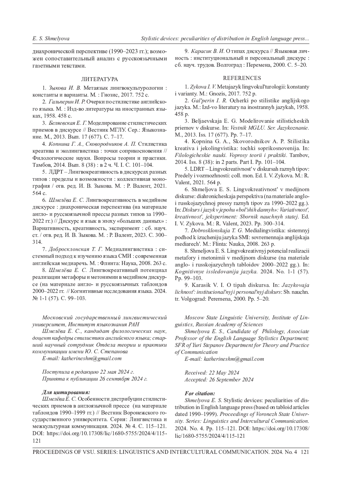 8. Шмелёва Е. С. Лингвокреативный потенциал реализации метафоры и метонимии в медийном дискурсе (на материале англо- и русскоязычных таблоидов 2000-2022 гг. //Когнитивные исследования языка. 2024. № 1-1 (57). С. 99-103. EDN: QMHTEQ